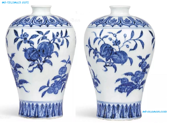 明永乐 青花折枝瑞果纹梅瓶 尺寸 28cm 成交价 RMB 38,141,200 香港苏富比 来源:名古屋茶道收藏,自1950年代始 说明 短颈圆唇,弧肩丰盈,下腹渐敛。青花绘寿桃、石榴、山楂、荔枝、枇杷、樱桃六组折枝果纹,写生淡雅,花实饱满,枝叶茂密。肩足分别画俯莲及仰叶纹。底涩胎不施釉。 |