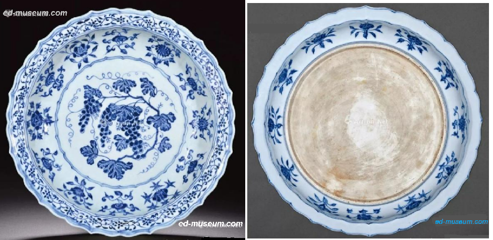 明永乐朝 御窑青花葡萄纹花口大盘 尺寸 口径43.2cm 成交价 RMB 20,700,000 北京东正 著录:1.《翰海十年纪念》2.《中国古代瓷器艺术》中国国家博物馆 P182 Lot.075 说明 来源:原为北京市文物公司旧藏 展览:中国国家博物馆 “中国古代瓷器艺术”展 记录:1995年4月12日 北京翰海 Lot.822