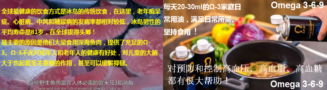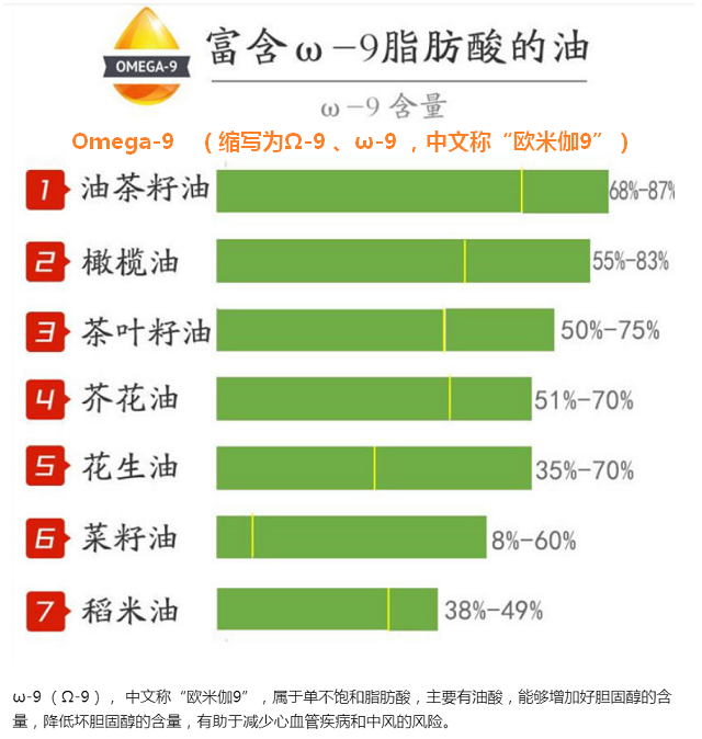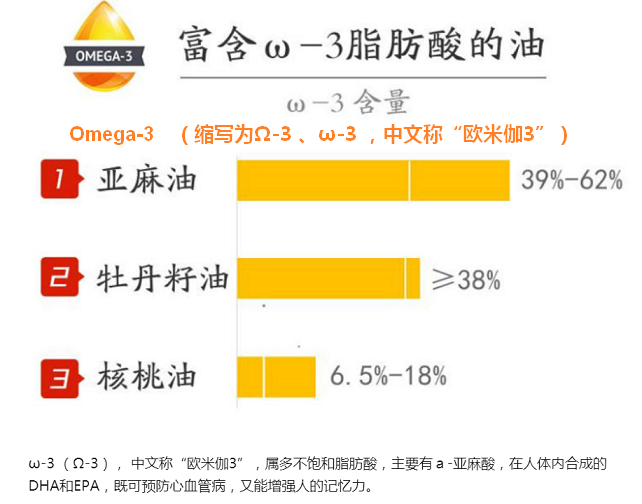 国家粮食局出台的《中国好粮油 食用油植物油》标准,列出了在我国常见油种的脂肪酸含量组成,以下就是据此列出的“三六九排行榜”,了解各油所长,才能选出最适合自己的那款油! 食用油由脂肪酸组成,这些脂肪酸可大体分为三类:饱和脂肪酸、单不饱和脂肪酸及多不饱和脂肪酸。 3种脂肪酸对人体都有健康意义,但前提是均衡摄入。专家指出,脂肪酸摄入不均衡是造成中国居民慢性病高发的原因之一。 按此前的观点,国际上曾经比较权威的膳食推荐值是饱和脂肪酸/单不饱和脂肪酸/多不饱和脂肪酸为1:1:1,中国营养学会曾推荐<1:1:1。 调和油是膳食脂肪酸的主要来源之一,因此,如果它的脂肪酸组成更均衡,那么也就意味着这款油更健康。 建议消费者不要长期食用单一的植物油产品,因为即使是理论上经过营养结构调整的调和油也不能保证摄入的脂肪酸足够均衡。而且每种植物油都各自的特点,消费者应该尽量将多种植物油轮换着吃,同时,要均衡饮食,鸡鸭鱼肉蛋等食物尽量每日都有摄入,确保各种来源的脂肪酸达到均衡。 2018年6月,《食品安全国家标准植物油(GB2716-2018)》正式发布,这意味着所有调和油以后都必须明确标示出各种油脂的添加比例。 欧米伽 3-6-9 含丰富不饱和性脂肪酸 欧米伽-6脂肪酸(n-6)和欧米伽-3脂肪酸(n-3)是人体自身不能合成,必需从食物获取的2类脂肪酸。 它们都参与体内免疫调节、炎性反应、血栓的形成与溶解等生物学过程,但是这两者的比值高低才是影响健康效应的关键。 流行病学研究表明,n-6和n-3脂肪酸的摄入比值过高(失衡)是导致心血管疾病、部分癌症的主要原因之一。 花生油、葵花籽油、玉米油、芝麻油等都是n-6/n-3比值非常高的油脂,长期只吃这种单一的油脂对健康不利。 联合国粮农组织(FAO)建议:n-6/n-3最佳摄入比值为(5~10):1;中国营养学会曾推荐:n-6/n-3的适宜比值是(4~6):1。 BBC: 全球最健康的饮食,是冰岛的传统饮食,最主要的原因是Ω-3! 【常见疾病调理方法】 【欧米伽3-6-9混合鱼油+多种维生素+多种微量元素】 Omega 369 oil 在人体的脂肪酸代谢过程中是一种非常重要的脂肪酸,功能是维持细胞与组织机能正常方面。 维生素和微量元素都是人体新陈代谢机能所必须的,随着年龄的增加(中年)以后,人体的新陈代谢率会下降,维生素和微量元素都是参与各种代谢或生物化学反应中重要因素,这些物质保持在必要的水平可以增加新陈代谢的效率,新陈代谢效率的增强,也就是机体各种生物功能的有效性增加,是人体活力的具体表现。而抗氧化剂简单地说就是有抗老化作用。 尽管人们可以从食物获得这些维生素和微量元素,但这有赖于食物的平衡或足够的量,如何做到这一点,常常并不被人们注意,所以,用复合营养补充剂可以保障一个最基本的食物平衡,有效保障人体所需。