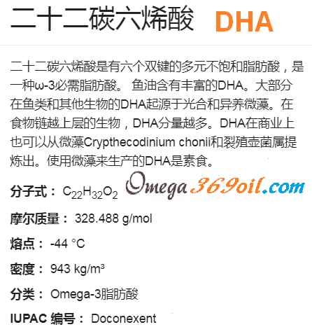 References Shin, H. S., & Kim, S. W. (1994). Lipid composition of perilla seed. Journal of the American Oil Chemistsó Society, 71(6), 619-622. Every kind of the sources are in the market approved by the U.S. Food and Drug Administration (FDA) or Canada Natural Health Products (NHPs). 不饱和脂肪酸的作用 1.调节血脂 丹麦科学家通过研究,对比分析食物和血液成分间的关系,发现以鱼类为主要食品的爱斯基摩人其食物中含有大量的脂肪和极少量的蔬菜,但爱斯基摩人却很少患心血管类疾病,原因是他们食物中鱼油的含量极高。 高血脂导致高血压、动脉硬化、心脏病、脑血栓、中风等疾病的主要原因,鱼油里的主要成分EPA和DHA,能降低血液中对人体有害的胆固醇和甘油三脂;能有效地控制人体血脂的浓度;并提高对人体有益的高密度脂蛋白地含量。维持低浓度血脂水平对保持身体健康,预防心血管疾病、改善内分泌都起着关键的作用。 2.清理血栓 随饮食补充的深海鱼油能够促进体内饱和脂肪酸的代谢,减轻和消除食物内动物脂肪(主要来自肥肉、奶制品等)对人体的危害,防止脂肪沉积在血管壁内,抑制动脉粥样硬化的形成和发展,增强血管的弹性和韧性。降低血液黏稠度,增进红细胞携氧的能力。鱼油中的EPA,还有防止血小板粘连、凝聚的功能,因此它可以有效防止血栓的形成,预防中风。 3.免疫调节 补充EPA、DHA。可以增强机体免疫力,提高自身免疫系统战胜癌细胞的能力。日本的研究发现鱼油中的DHA能诱导癌细胞“自杀”。 另据有关资料报道,鱼油对预防和抑制乳腺癌等作用十分显著。 Omega-3系列不饱和脂肪酸可用以协调人体自身免疫系统,在英国、美国和一些发达国家中,深海鱼油还被用来辅助治疗糖尿病、牛皮癣、类风湿性关节炎及系统性红斑狼疮疾病。深海鱼油还对过敏性疾病、局限性肠胃炎和皮肤疾患有特殊疗效。 4.维护视网膜提高视力 DHA是视网膜的重要组成部分,约占40~50%。补充足够的DHA对活化衰落的视网膜细胞有帮助,对用眼过度引起的疲倦、老年性眼花、视力模糊、青光眼、白内障等疾病有治疗作用。 DHA还可提供视觉神经所需营养成分,并防止视力障碍。 5.补脑健脑 DHA是大脑细胞形成发育及运动不可缺少的物质基础。人有记忆力、思维功能都有赖于DHA来维持和提高。 补充DHA可促进脑细胞充分发育,延缓智力下降,健忘及预防阿尔茨海默病(老年痴呆症)等。 6.改善关节炎症状减轻疼痛 Omega-3系列不饱和脂肪酸可以辅助形成关节腔内润滑液,提高体内白细胞的消炎杀菌的能力,减轻关节炎症状,润滑关节,减轻疼痛。