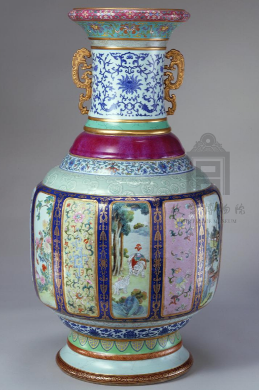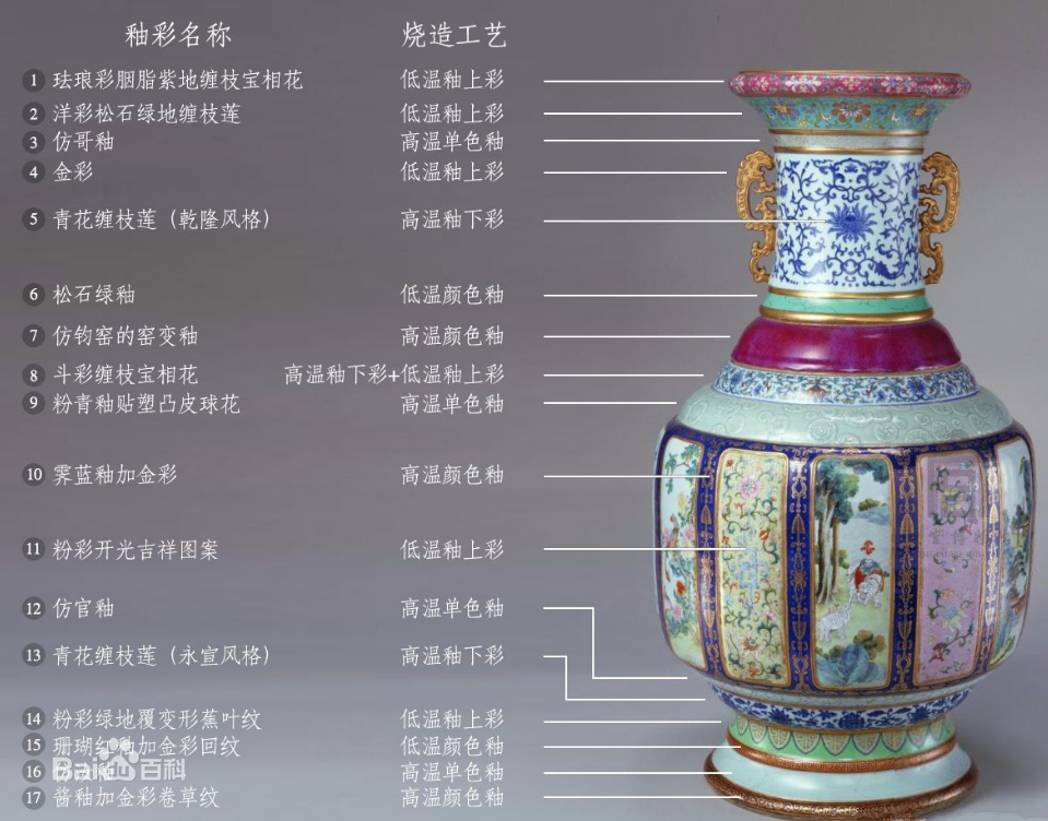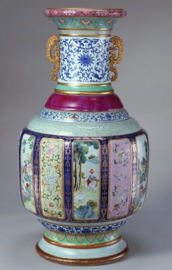 将各色釉、各类彩集于一身,为乾隆朝独创。做出这么矫情的事情,一定是丰衣足食之后。官窑瓷器烧造,清康熙恢复,雍正朝发扬光大,至乾隆朝达到顶峰。顶峰一定要有旗帜飘扬,瓷母就是这面飘扬的旗帜。