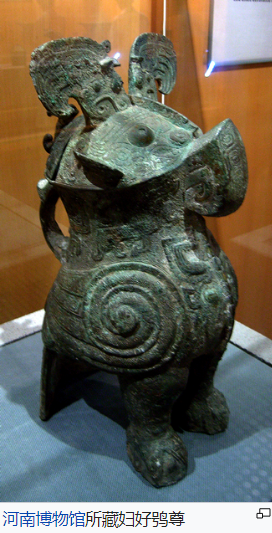 藏品中,青铜器佔468件,样式很多,有不少纹饰华丽的大件器物,以礼器和武器为主。礼器有炊器、食器、酒器、水器等。有“妇好”铭文的鸮尊、盉、小方鼎各一对,司母辛铭文的大方鼎、四足觥各一对。尤以三聯甗、偶方彝造型最为奇特。 妇好鸮尊是一件商代后期的青铜器,1976年出土于河南省安阳市殷墟妇好墓,共两件,分别藏于中国国家博物馆和河南省博物院。妇好为商王武丁的配偶。 |