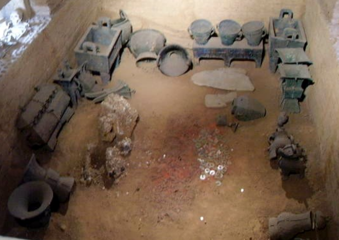 The artifacts unearthed within the grave consisted of: 755 jade objects (including Longshan, Liangzhu, Hongshan and Shijiahe cultural artifacts) 564 bone objects (including 500 hairpins and 20 arrowheads) 468 bronze objects, including over 200 ritual bronze vessels,[9] 130 weapons, 23 bells, 27 knives, 4 mirrors, and 4 tiger statues.[10] 63 stone objects 11 pottery objects 5 ivory objects 6,900 cowry shells (used as currency during the Shang dynasty)
