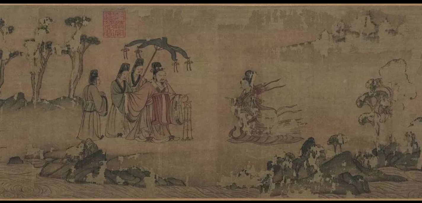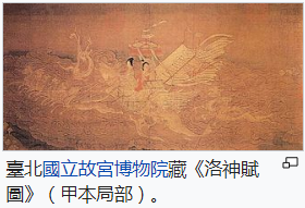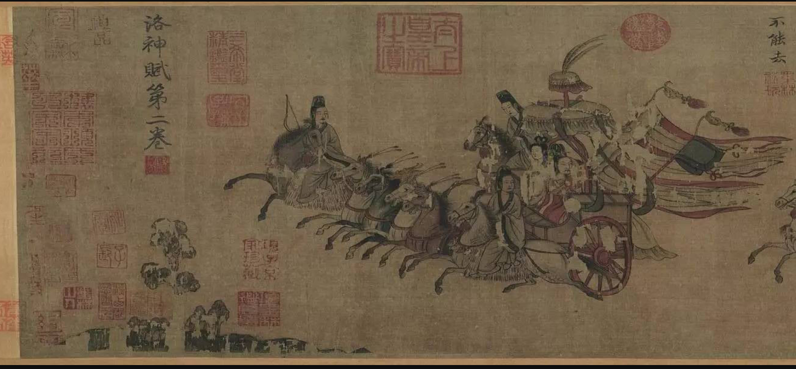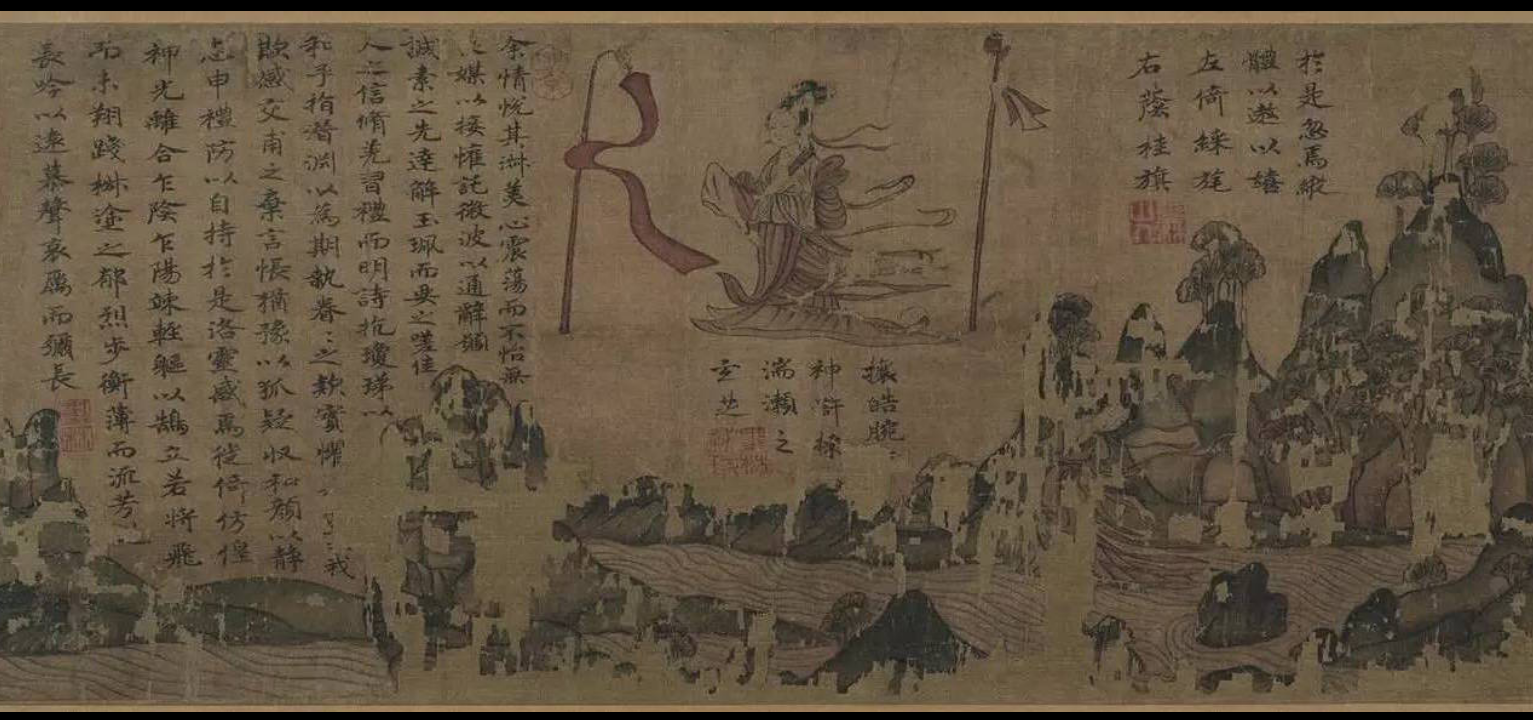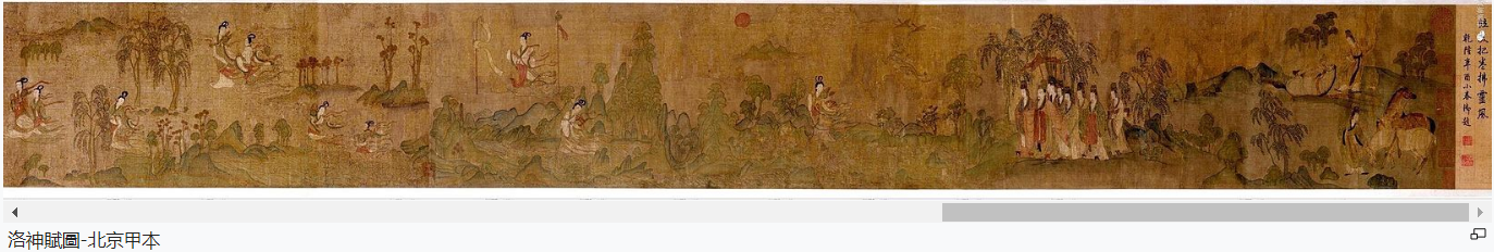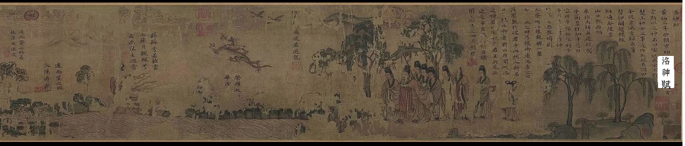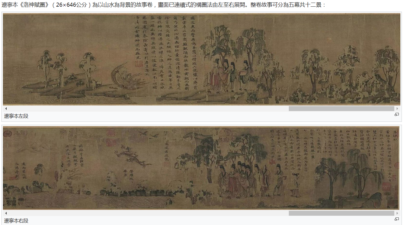 辽宁本《洛神赋图》(26×646公分)为以山水为背景的故事卷,画面已连续式的构图法由左至右展开。整卷故事可分为五幕共十二景: