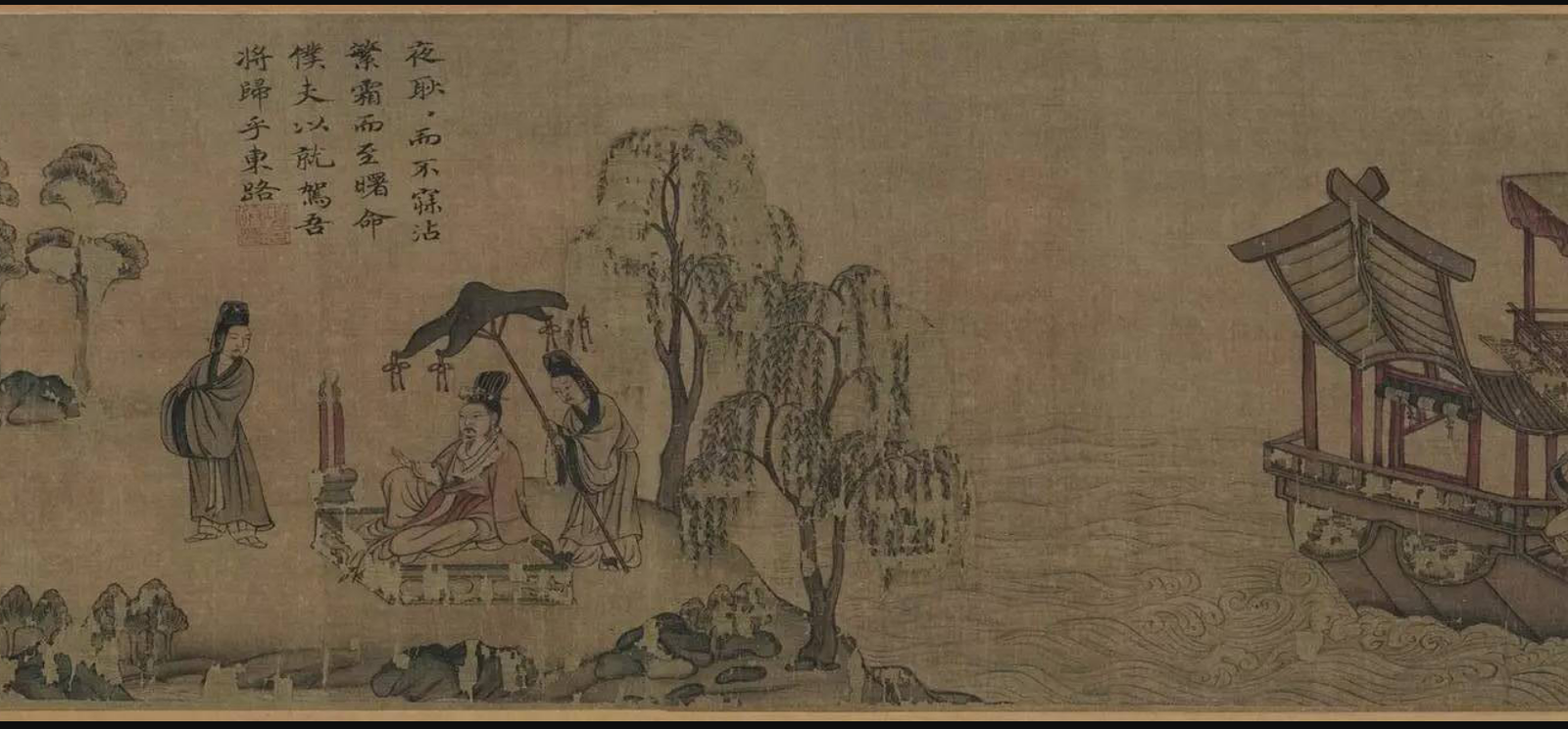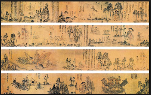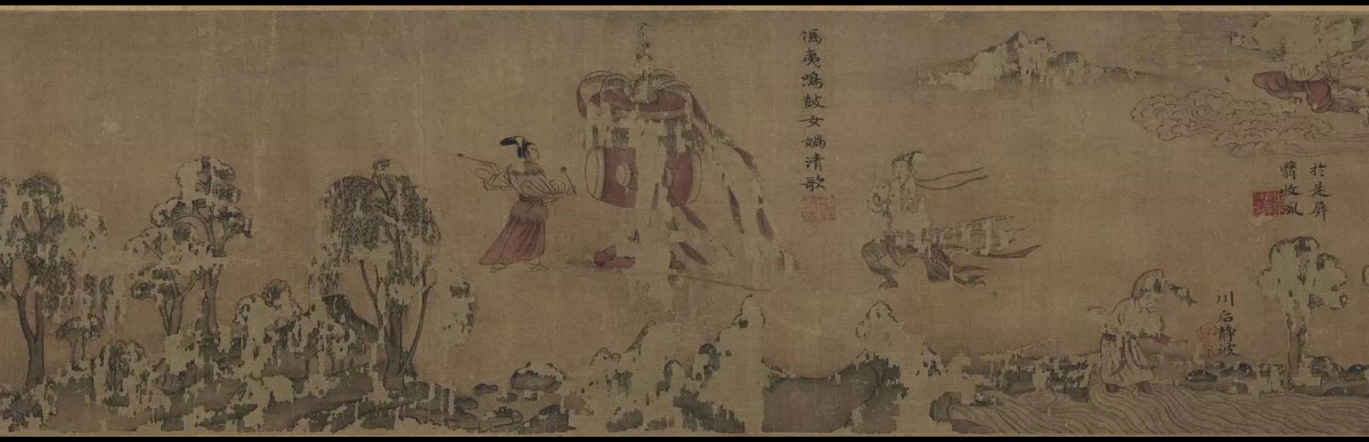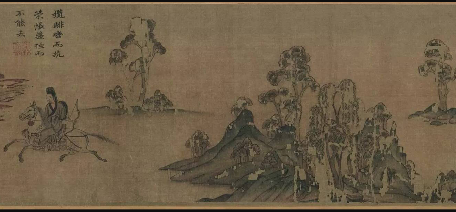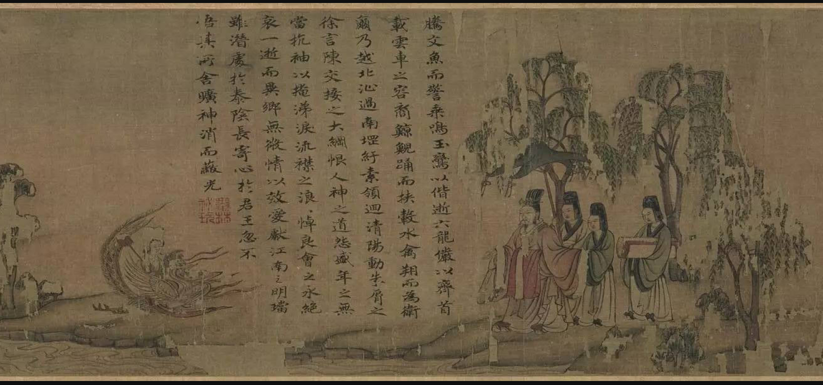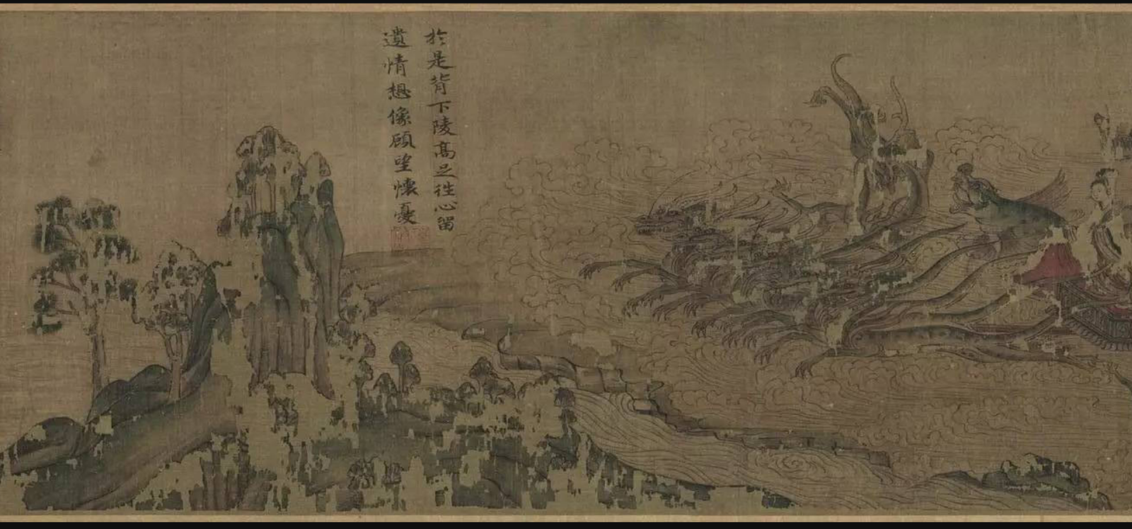 辽宁本《洛神赋图》(26×646公分)为以山水为背景的故事卷,画面已连续式的构图法由左至右展开。整卷故事可分为五幕共十二景:
