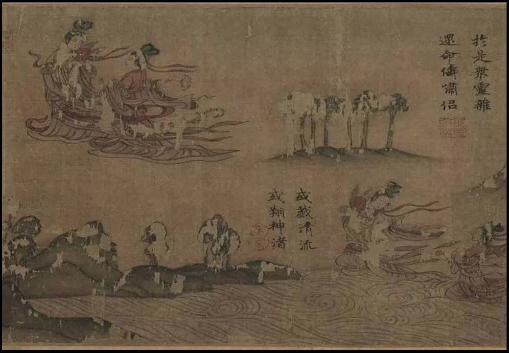 在场景的右上方山林间及左边小山林下各出现两列赋文。第一段赋文:「于是众灵杂沓,命俦啸侣。或戏清流,或翔神渚。」画中右下方出现两个女神在水中嬉戏,描绘「或戏清流一句」。画中左上方则是两个女神在岸上的天空处悠游,居左者手持羽扇,居右者似持莲花,描「或翔神渚」此句。