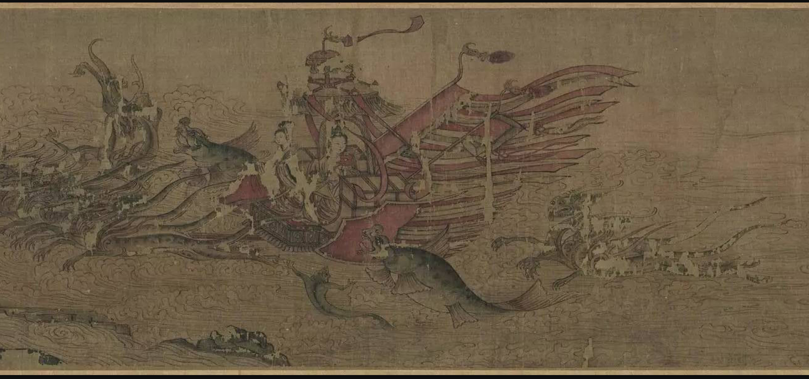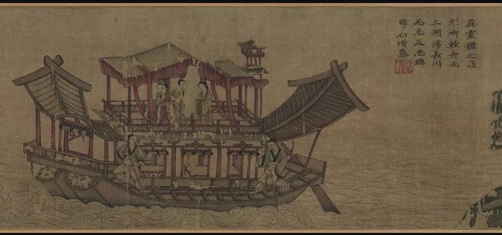 第一景〔泛舟〕描绘曹植承舟溯水,追求洛神的情景。「冀灵体之复形,御轻舟而上溯。浮长川而忘反,思绵绵而增慕。」曹植坐在精致楼船上层,船蓬上垂曼垂带飘动,浪花拍打船身,表现木船前进的状态。