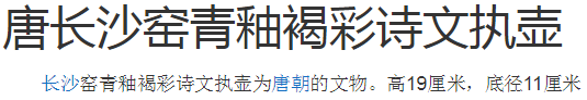 | 长沙窑青釉褐彩诗文执壶为唐朝的文物。高19厘米,底径11厘米,1983年出土于湖南长沙窑窑址。现收藏于湖南省博物馆。