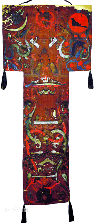 《长沙马王堆汉墓帛画》,又称《升天图》。绢本,设色。纵205厘米,上横92厘米,下横47.7厘米。1972年出土于湖南省长沙市东郊东屯渡乡(今芙蓉区马王堆街道),现藏湖南省博物馆。