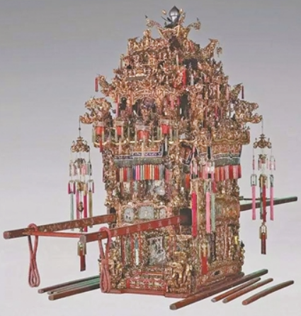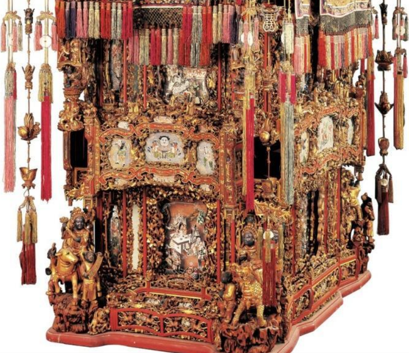 統萬工轎通常高3米,寬2米,有7層樓閣,5座主亭,稱為「五嶽朝天」;中亭頂上站著威風凜凜、手擎毛筆的「魁星點狀元」,四周用朱金雕刻層層裝飾點綴,再襯以繡片、珠翠、流蘇、鏡片,極盡奢華。從南宋開始,寧波姑娘出嫁坐花轎之風愈來愈盛,花轎製作也愈來愈考究。這就是萬工轎的由來。 |