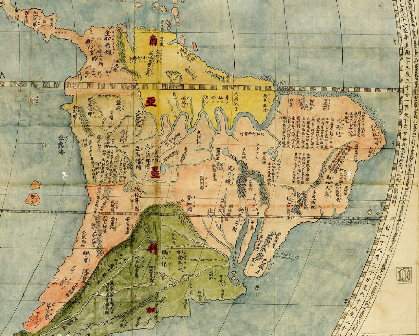 根据这副图的注解,能证明中国在明朝甚至以前的时期里就已经了解包括南美洲在内的许多地方。地图中南美洲部分的一段注文称:“南亚墨利加今分为五邦,一曰孛露,以孛露河为名;二曰金加西蜡,以所产金银之甚多为名;三曰坡巴牙那,以大郡为名;四曰智里,古名;五曰伯西儿,即中国所谓苏木也”,另一段注文称:“伯西尔此古苏木”。 | |||||