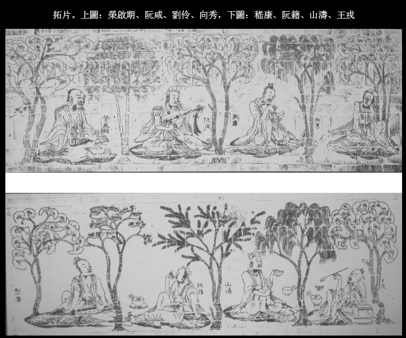 目前全国仅在以上五处南朝墓葬中发现过《竹林七贤与荣启期》砖画。五处墓葬均位于江苏省境内,其中丹阳的三座基本确认为南齐帝王墓。南京西善桥及雨花台两处墓葬虽无定论,但根据墓葬规格,依然被认为是皇室等级的高级别墓葬。这些砖画不仅题材内容相同,而且规模、构图与表现手法也极为相似,其中南京的西善桥及雨花台两处砖画疑似使用同一模范烧制,其余砖画仅在细节描绘与工艺水平上有所差异。 以南京西善桥砖画为例,全套砖印模画长244厘米,宽88厘米,由超过300块墓砖组成,分为两块用于装饰墓道两侧。从外至内,分别绘有向秀、刘伶(砖文作刘灵)、阮咸、荣启期四人及嵇康、阮籍(砖文作阮藉)、山涛、王戎四人,中间以银杏、槐树、柳树等分隔。以线条表现,技法纯熟,简练传神。八人在林中席地而坐,或举目凝神,或抚琴啸歌,或端杯对酒,或昂首倾听,人物性格特征鲜明,栩栩如生。 于南京雨花台发现的画像砖有部分从墙上脱落脱落,显露出背面刻有「嵇上行十五」「向下行廿一」等文字,旁边模印阳文「上」。学者推测,砖画可能是先以整幅的绢布作画,完成后按尺寸分割制作木模,再将木模画转印在砖坯上,分别烧制。烧制时将每块砖按行列编上号,砌筑时工人即可依照编号拼对完成。 「竹林七贤」是指魏末晋初的七位名士,即阮籍、嵇康、山涛、刘伶、阮咸、向秀、王戎。活动区域在当时的山阳县,相当于今河南辉县西北一带。七人在生活上不拘礼法,不羡慕高官厚禄,思想上倡导任性自然,推崇养生。常聚于林中喝酒纵歌,洒脱倜傥,他们代表的「魏晋风度」受到南朝人的极力推崇。而荣启期是春秋时期的隐士,以遗弃世俗名利,知足常乐著称,与竹林七贤的思想有共同之处。 将两组不同时代的人物同时画在一张图内的寓意,除了满足了构图上对称的需要外,一说是有视荣启期为七人楷模之意,另一说则认为是南朝时期长生升仙思想的反映。 |