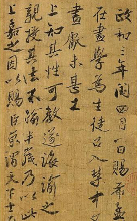 政和三年闰四月八日赐。希孟年十八岁,昔在画学为生徒,召入禁中“文书库”,数以画献,未甚工。上知其性可教,遂诲谕之,亲授其法,不逾半岁,乃以此图进。上嘉之,因以赐臣京,谓天下士在作之而已。