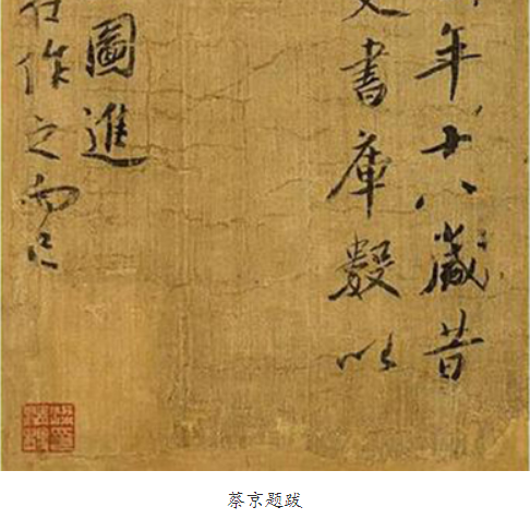 王希孟花费了半年时间完成近12米的长卷──《千里江山图》,采用如此巨大的尺幅,得到了宋徽宗的嘉许和称赞,该画当成奖品赏赐给了蔡京。蔡京为此画写了一段题跋。