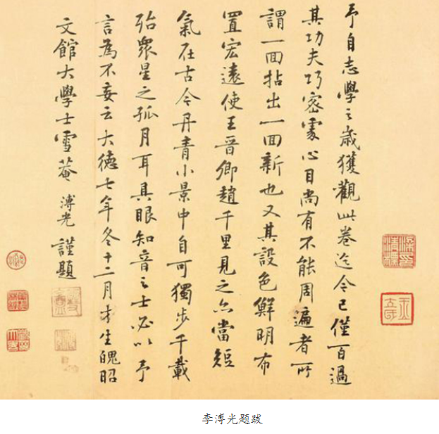 《千里江山图》元代李溥光跋:予自志学之岁,获睹此卷,迄今已近百过。其功夫巧密处,心目尚有不能周遍者,所谓一回拈出一回新也。又其设色鲜明,布置宏远,使王晋卿、赵千里见之,亦当短气。在古今丹青小景中,自可独步千载,殆众星之孤月耳。具眼知音之士,必以予言为不妄云。──大德七年冬十二月才生魄昭文馆大学士雪庵溥光谨题。