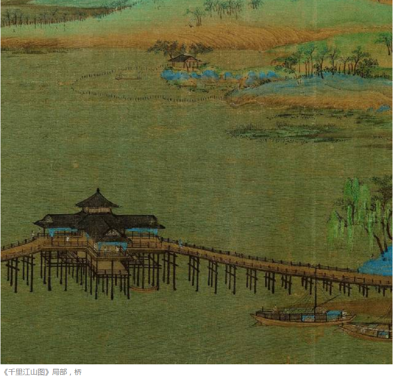 《千里江山图卷》是难得的流传至今的北宋青绿山水大长卷,被誉为“中国十大传世名画”之一。此卷表现了绵亘起伏的群山和烟波浩淼的江湖,配置渔村野市,水榭亭台,茅庵草舍,水磨长桥,并穿插捕鱼、驶船、行路、赶脚、游玩等人物活动。全面继承了隋唐以来青绿山水的表现手法。此卷后面附有宋代蔡京、元代溥光的后跋,在清代曾经梁清标和清宫旧藏,著录于《石渠宝笈初编》等。