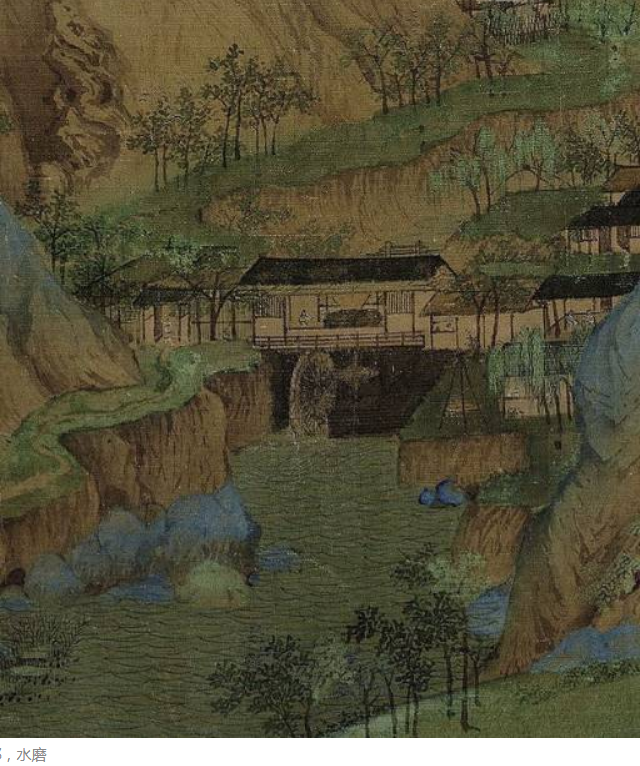 画中远近山水,气势开阔,村舍集市、渔船客舟、桥梁水车和林木飞禽,笔墨工致,位置得宜;全卷青绿重设色,表现了山河秀丽。 |