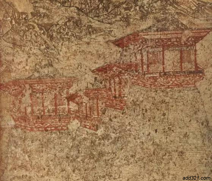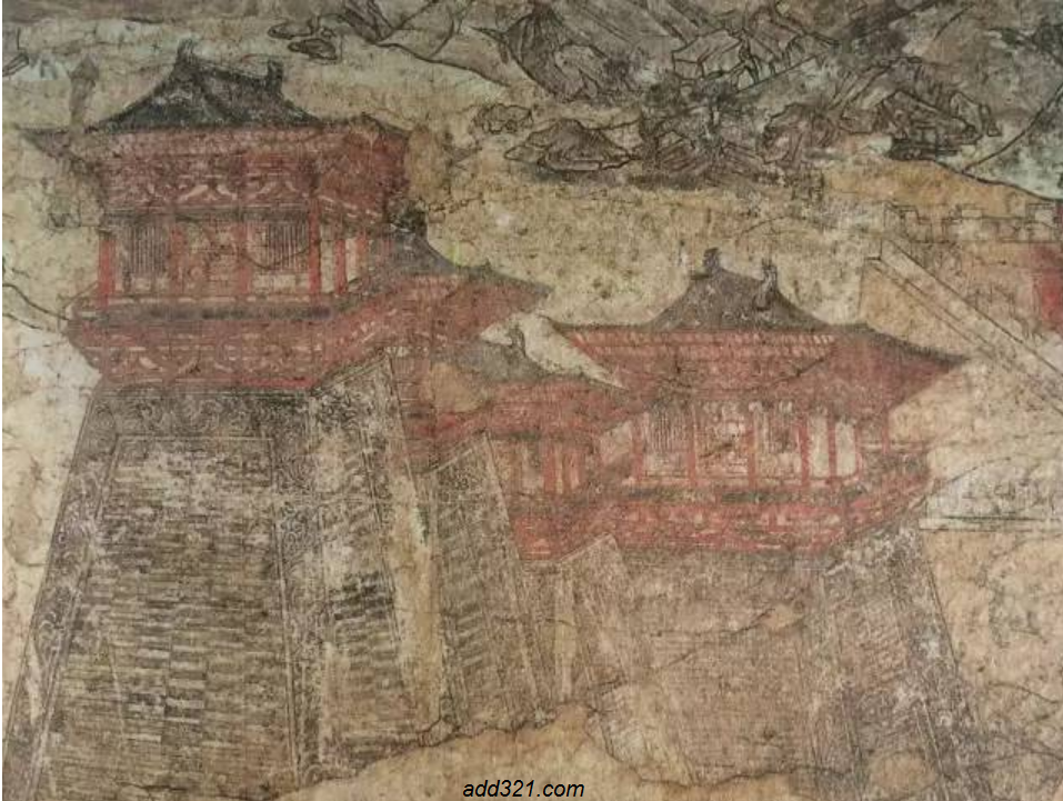 这两幅阙楼图,被誉为唐墓壁画中的明珠,它们雕栏朱栋,金碧辉煌,在淡绿色的远山的衬托下,更显示出盛唐宫阙的富丽堂皇。阙楼可分为四部分:屋顶、屋身、平坐、墩台。屋顶为庑殿式,颜色深红;屋身和平坐皆用朱色平涂,一片红丹丹的色彩,一种富贵逼人的效果;墩台为砖木结构,中间用长方形砖砌成,周围有忍冬蔓草花纹,皆用褐 |