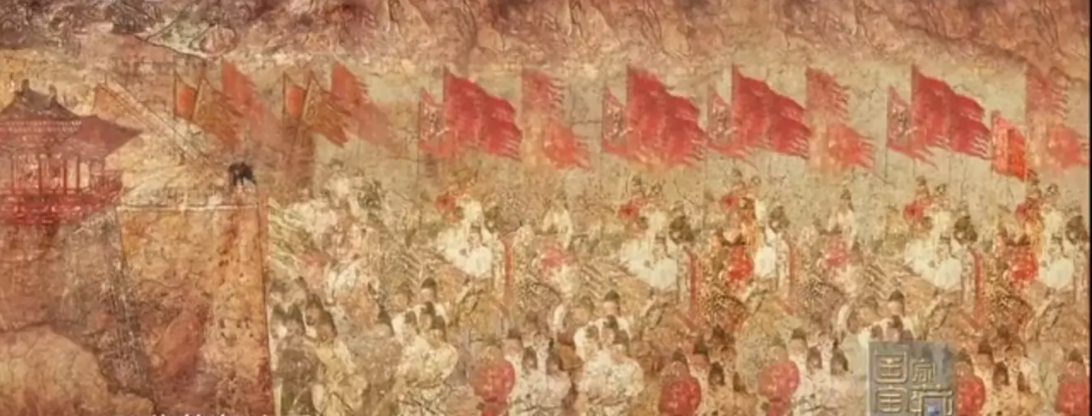 《阙楼仪仗图》是罕见的唐代绘画珍品杰作。壁画绘制了唐代宫门前,标志性的阙楼建筑,由高到底分为三层,为后人留下了难得的唐代宫殿建筑实景图。包容万象的唐文化,恰如今日的中华民族,蕴藉历史之气韵,再现盛世的风范。