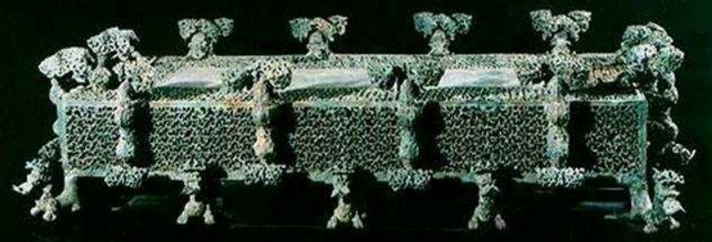云纹铜禁整体用失蜡法铸就而成。其工艺精湛复杂。历史文献记载的中国失蜡法工艺的时间最早是在唐代初年,据《唐会要》记载,唐高祖武德年间铸造开元通宝,用的便是失蜡法。因失蜡法文献所见较晚,学界一般认为中国失蜡法工艺源自于印度。但云纹铜禁是楚康王在位时的令尹子庚随葬品之一,铸造年代不晚于公元前552年。云纹铜禁的出土,将中国失蜡法铸造工艺的历史向前推进1100年。 |