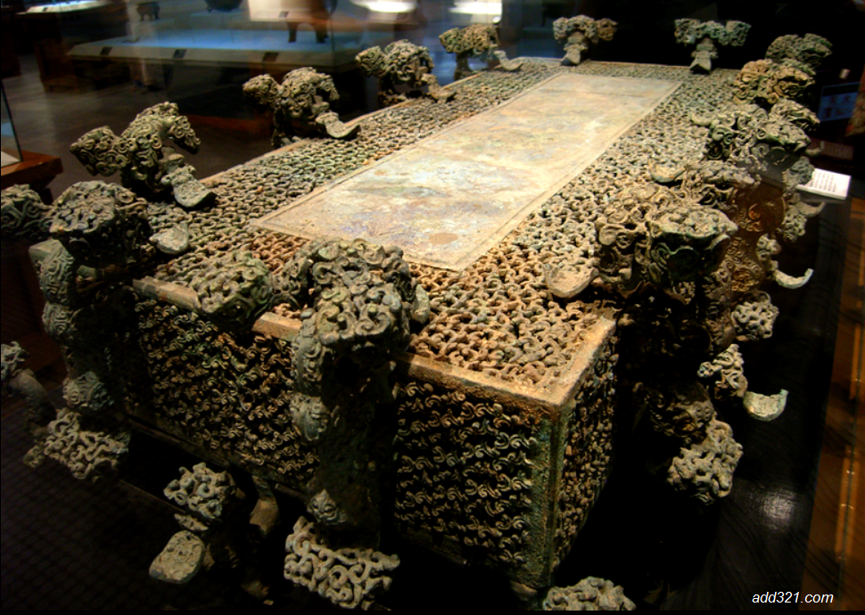 铜禁四周以透雕的多层云纹做装饰,通透性较好,似天空飘浮的朵朵白云,禁身的上部攀附着12条龙形异兽,它们凹腰卷尾,探首吐舌,面向禁的中心,形成群龙拱卫的场面,另外有十二只异兽蹲于“禁”下为足。其器身由粗细不同的铜梗支撑,这些铜梗共分5层,最内较粗的一层是梁架。每根梁架两侧伸出多处支梗,犹如古代建筑上的斗拱。多层重叠,纵横交错,支梗又相互卷曲盘绕,而又互不连接,全由内层作支撑,工艺十分复杂而又精良。禁的四周盘龙踞虎,大概是取神兽警示之意。 |