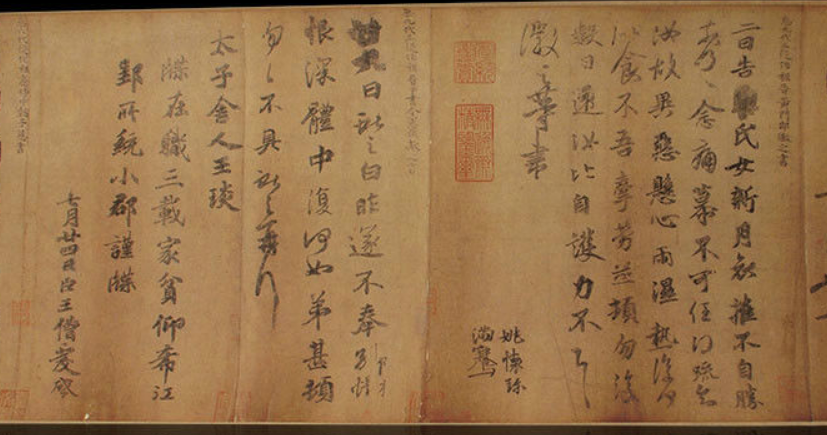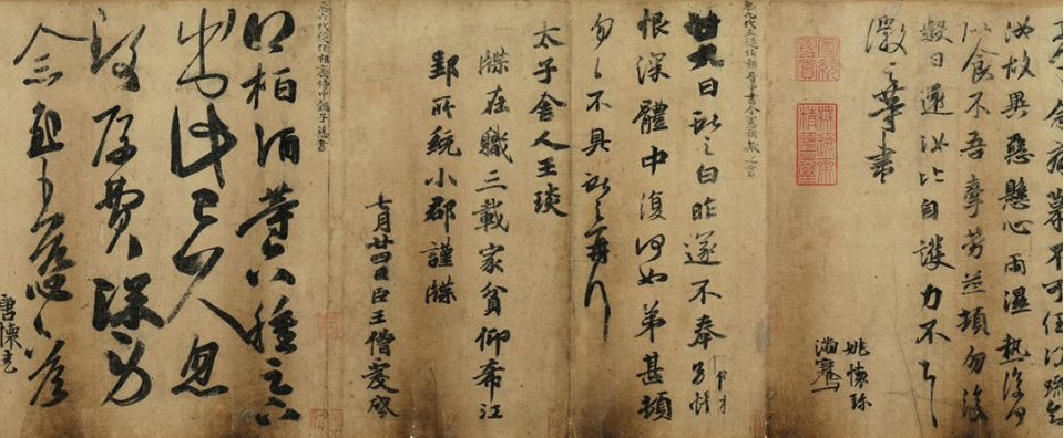 藏于辽宁省博物馆的《万岁通天帖》前后钤有唐宋间诸旧藏印。《万岁通天帖》上有北宋“史馆新铸之印”朱文方印、“颖川祯”朱文半印、“居仁文府”白文印、“临濮侯裔世家”白文方印、“种杏轩”白文方印、南宋“绍”“兴”朱文连珠印。元“王芝”朱文长方印、“王芝”白文椭圆印、“王芝私印”白文方印、华幼武“春草堂审定记”等印。 |
