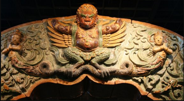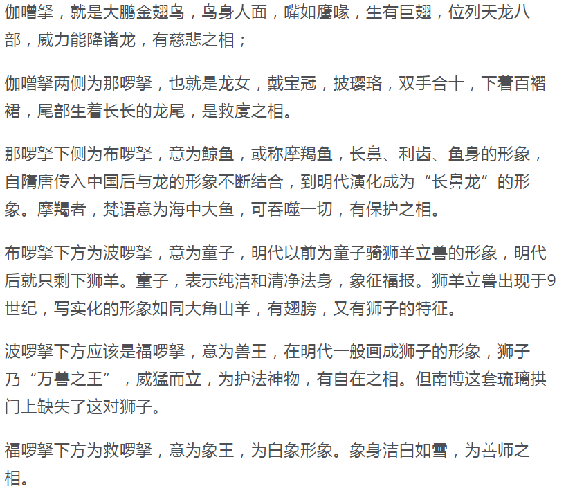 这座拱门是用明代大报恩寺琉璃塔的一套备用构建复原而成,门上的形象为藏传佛教密宗所特有的法相装饰,门顶端高举着神态威武的金翅大鹏鸟,两侧对称设置龙女、摩羯鱼、狮羊立兽、白象王等神像和神兽。据史料记载,在当年建造大报恩寺塔石共烧制的三套完整的塔身构建,一套用于施工,两套埋于地下,用于以后的维修。这座拱门就是当时备用两套中的一套。