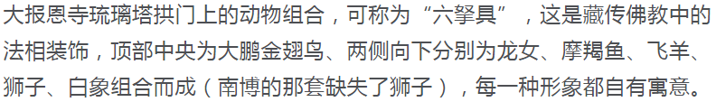 在北京的明代建筑上,也有多个类似的形象,明永乐年间所建真觉寺金刚宝座塔的前后门券,以及塔座上小佛塔佛龛的门券上都有和南京大报恩寺琉璃塔门券图案类似的。