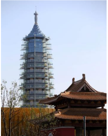 该建筑采用四组钢管斜梁跨越遗址上空,地梁落脚点位于原来塔基遗址的外侧,既减少对遗址的扰动,又起到保护地宫的作用。不过为了传承历史记忆,最终还是将保护建筑做成了轻质的九层塔,其规模、形制、长细比与原塔近似,并定名为‘大报恩塔’。” |