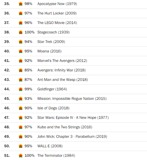 35.Apocalypse Now 36.The Hurt Locker 37.The Lego Movie 38.Stagecoach 39.Star Trek