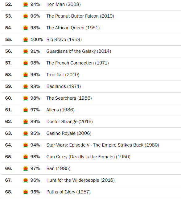 52.Iron Man 53.The Peanut Butter Falcon 54.The African Queen 55.Rio Bravo 56.Guardians of the Galaxy